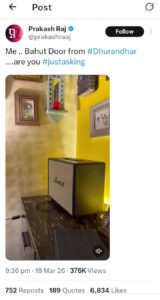 प्रकाश राज ने एक एक्स पोस्ट में, एक वीडियो में रेडियो पर हम दोनों (1961) का गाना अभी ना जाओ छोड़ कर बजाया जा रहा है, जिसमें देव आनंद और साधना हैं। इसके साथ उन्होंने कैप्शन दिया, ‘मैं धुरंधर से बहुत दूर हूं। क्या आप हैं?’